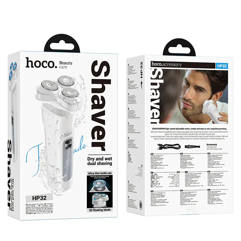 7. Accessories: shaver, cover, charging cable, brush, white color