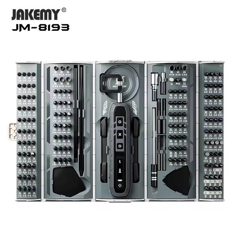 Take your DIY and tech repair game to the next level with the Jakemy JM-8193, a premium 180-in-1 precision screwdriver set designed for professionals and enthusiasts alike. Whether you’re fixing phones, laptops, tablets, game consoles, watches, glasses, or other electronics—this kit has every bit and tool you’ll ever need, all packed in a sleek, futuristic organizer case.