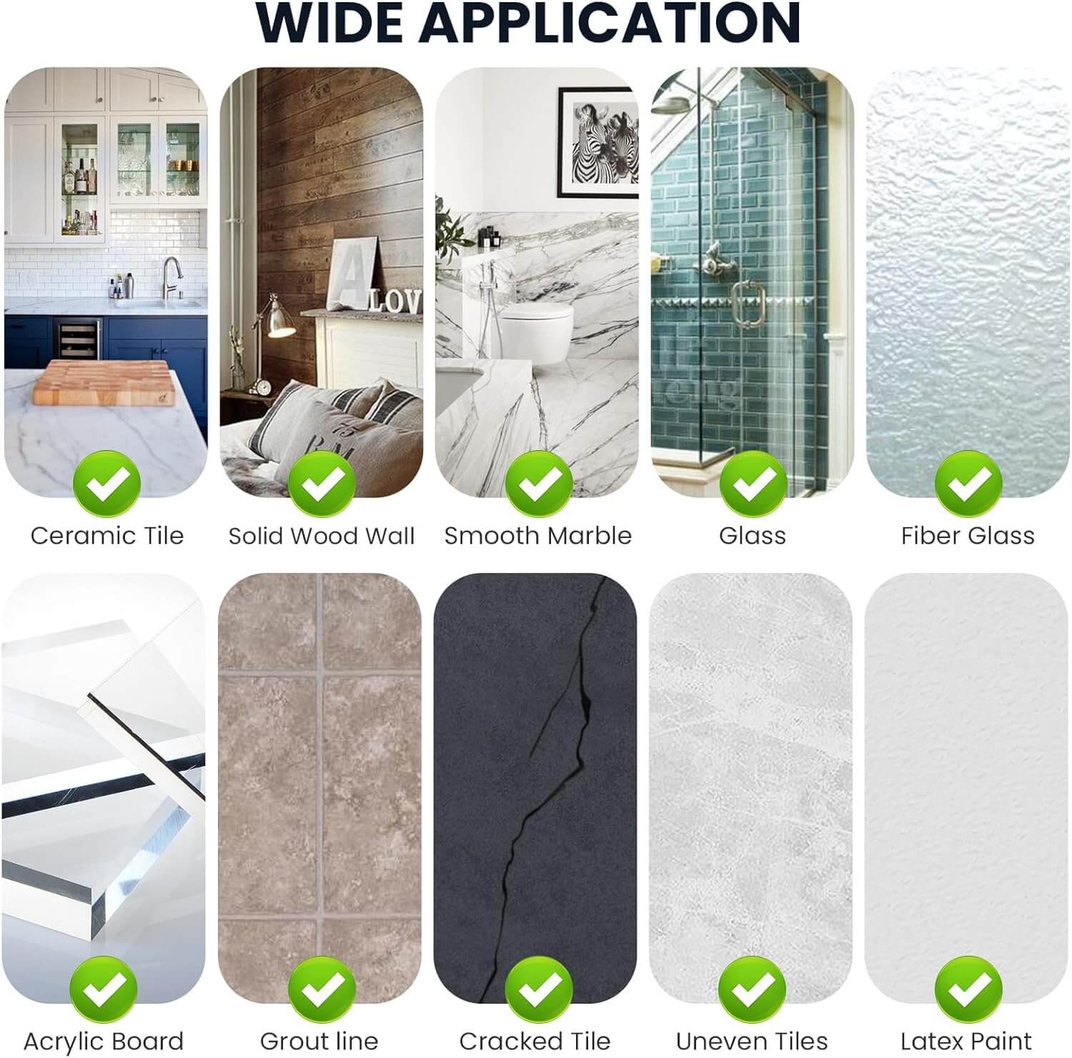 Works on ceramic tile, smooth marble, glass, acrylic, fiberglass, solid wood walls, grout lines, cracked tiles, uneven tiles, and latex paint. (Only fits standard 90° right-angle corners)