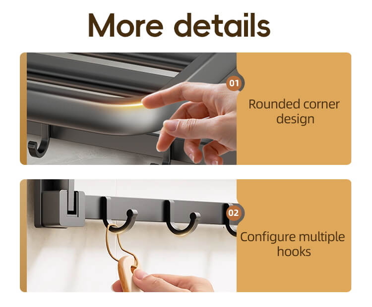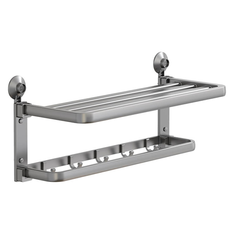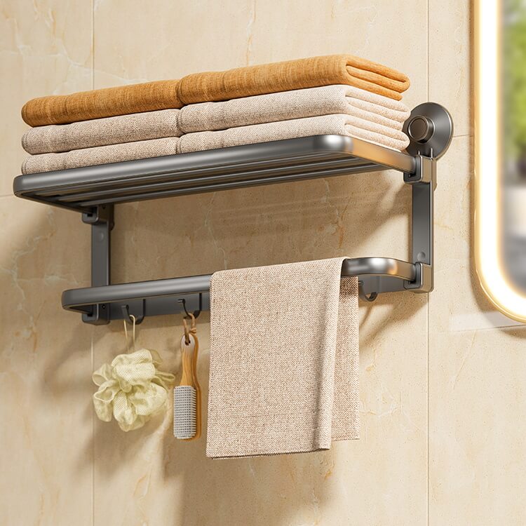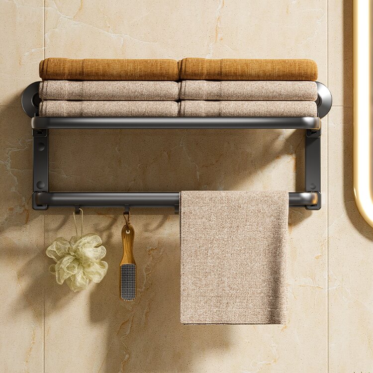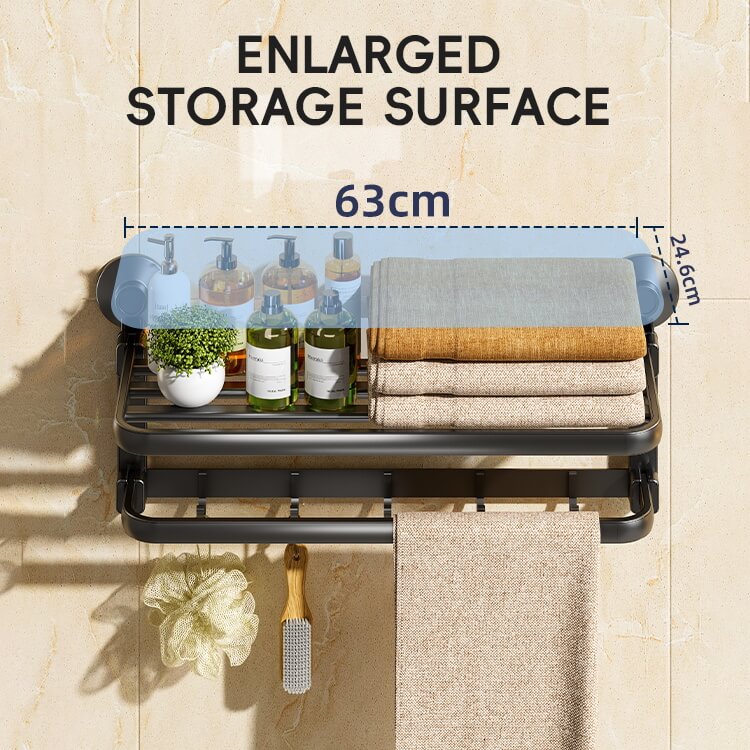 Dual Rack Design: Top shelf for folded towels, bottom bar for hanging towels, and hooks for loofahs or brushes