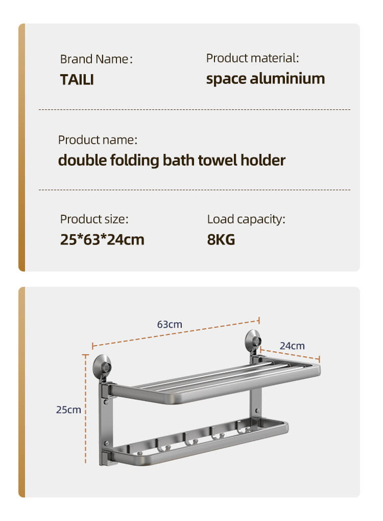 Upgrade your bathroom with the Taili Double Folding Bath Towel Holder, designed for functionality and elegance. Made from premium space-grade aluminum, this rustproof rack features a strong vacuum suction system—no drilling, no tools, no damage to your walls.