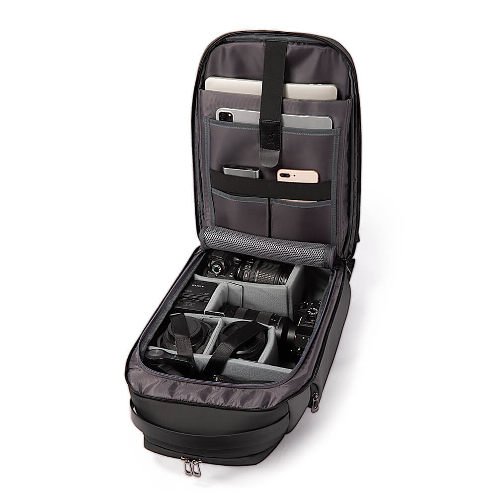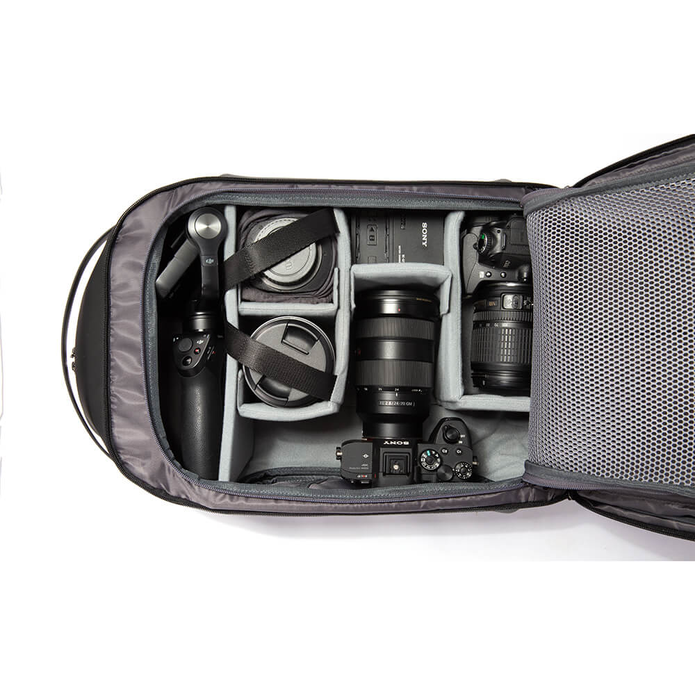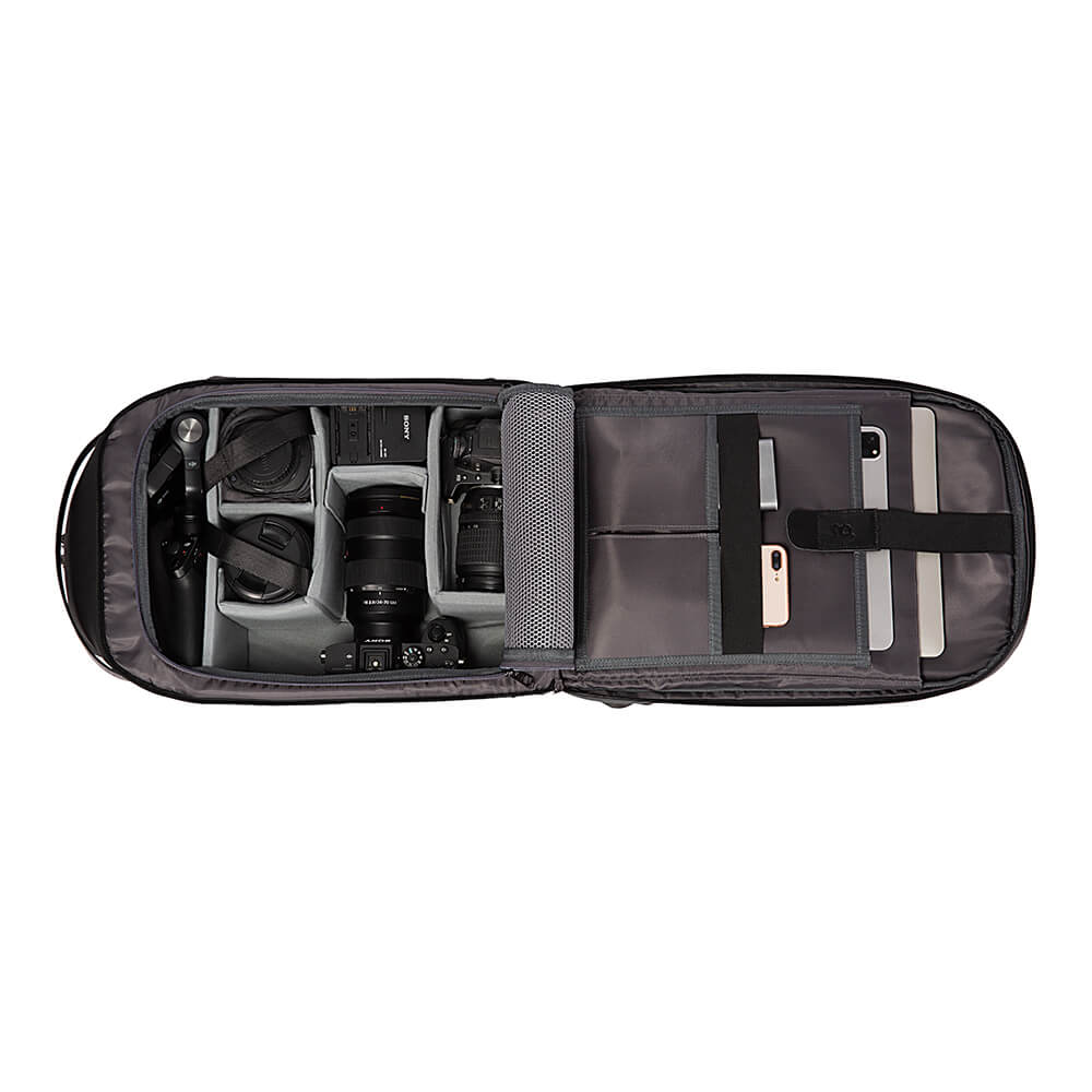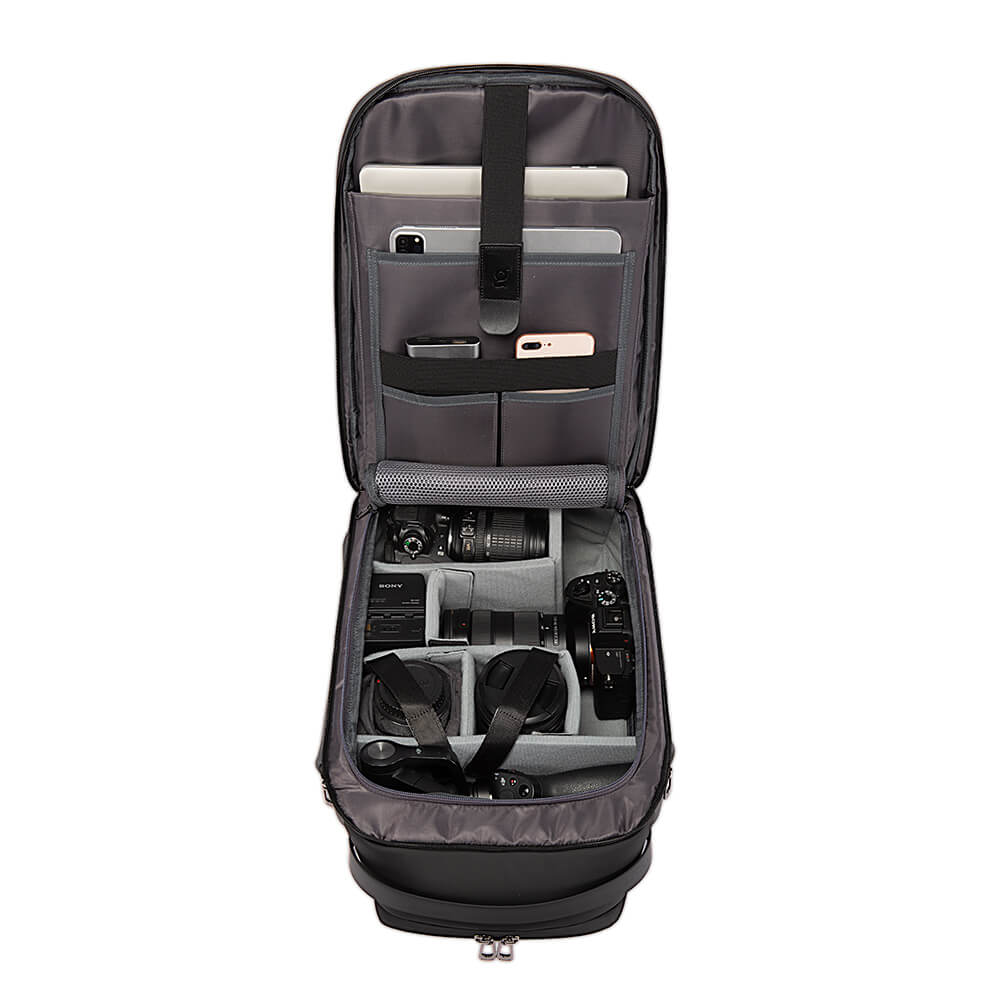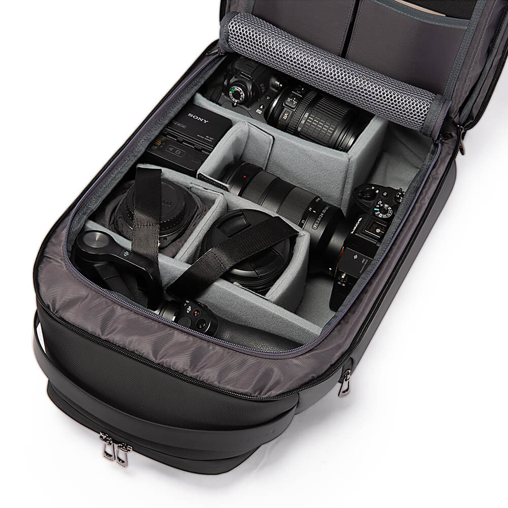 Interior compartment: separate laptop compartment; Camera compartment; Lens compartment; Accessory compartment