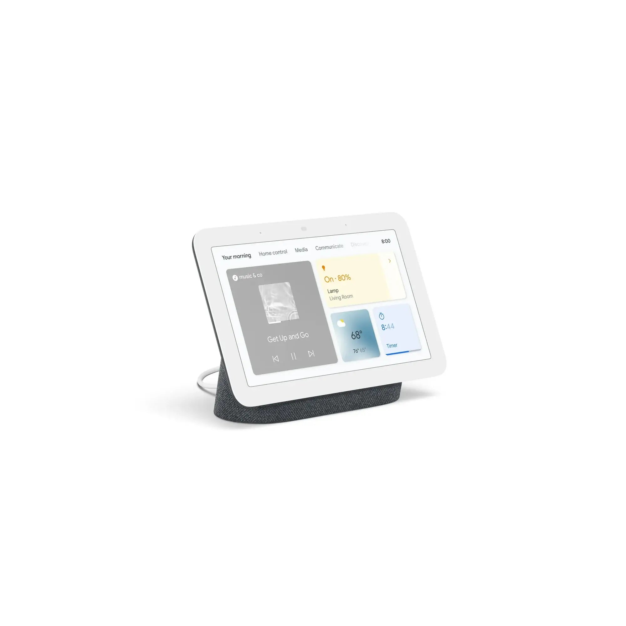 The easiest way to be entertained. Catch up on your favorite Netflix shows. Watch YouTube videos and more. And listen to music on the enhanced speaker. Stream from the music services you use most, like YouTube Music, Spotify, and Pandora. You can see what’s playing right on the display. Play, pause, browse, and control the volume with a tap. Or just say “Hey Google.”2The hub of your connected home. Nest Hub is the one place to control your smart home – it works with thousands of compatible devices. Turn on the lights, lock the doors, or turn up the thermostat with a tap. Or ask Google and get help even faster.4 Nest Hub also works with Nest video doorbells and cameras. Just say, “Hey Google, show me the front door camera” to see your live feed. Keep your family connected. Nest Hub is full of help for your busy home. See your calendar and create reminders and to-dos. Just say, “Hey Google, broadcast it’s dinnertime” and everyone will hear it on your Nest speakers and displays around the house. Ask Google about the weather or almost anything. Leave quick messages you can see at a glance. And make voice calls with Google Duo.5 Wind down easily. Wake up gently. With Nest Hub on your bedside table, you can fall asleep and wake up easier. The display dims to make your bedroom more sleep-friendly. From the “Your evening” page, set your alarm, control your compatible lights and other connected devices, and play soothing sounds to help you drift off. Nest Hub’s Sunrise Alarm wakes you up gently, and with Motion Sense, just wave your hand to snooze. Nest Hub respects your privacy. At any time, you can turn off the mic with the mic switch. And easily clear your Google Assistant history whenever you want. Thoughtfully designed, inside and out. Nest Hub’s subtle design fits any room. The display adjusts to ambient room light, so it’s not too bright or too dim. It shows your best shots from Google Photos automatically, so your favorites are always in the background. And it’s made with the environment in mind – 54% of its plastic part material is made with recycled content.