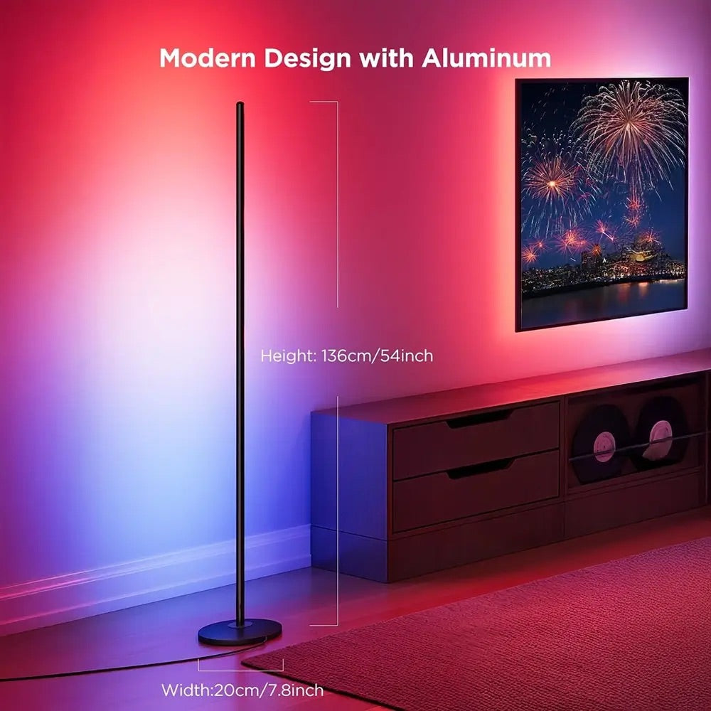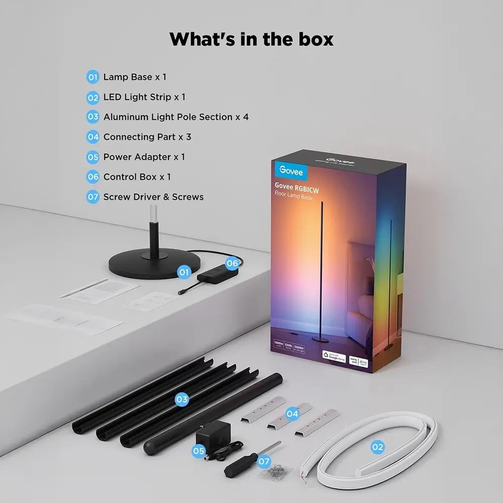 The Govee Floor Lamp Matter Compatible is a 136 cm tall smart lamp featuring RGBIC LEDs with over 16 million colors and a brightness of 1000 lumens. It includes separate warm white LEDs and supports dynamic color effects, music syncing, and scene modes. Fully Matter-enabled, it works seamlessly with a wide range of smart home ecosystems for effortless interoperability. Control it via the Govee Home App or voice assistants (Alexa, Google Assistant, Siri), and group multiple lamps for synchronized control. Energy-efficient and easy to set up, this lamp is perfect for living rooms, gaming spaces, or creating the ideal mood in any indoor environment.