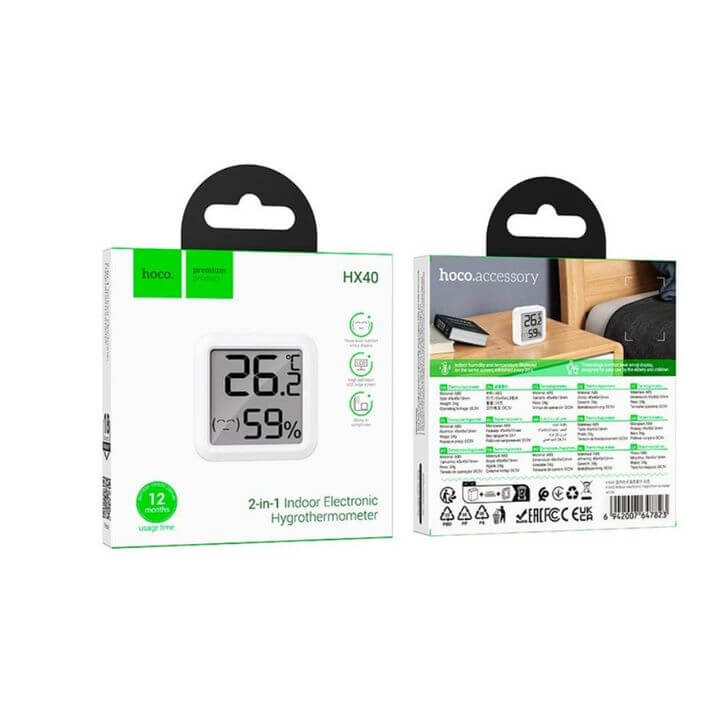 HOCO HX40 is a Compact and Functional Electronic Thermohygrometer Designed to Accurately Measure Temperature and Humidity in the Room. High-Quality Materials, It Will Become An Integral Part of Your Home or Office, Ensuring The Comfort and Health of Your Family or Colleagues. The Device Body is Made of Durable ABS Plastic, Which Ensures Durability and Resistance to External Influences. Compact Dimensions and Light Weight Allow You to Place The Device in Any Convenient Place - on a Table, Shelf or Mounted on a Wall. The Clear and Bright LCD Display Simultaneously Displays Temperature and Humidity Readings, Allowing You to Quickly Assess The Indoor Microclimate.