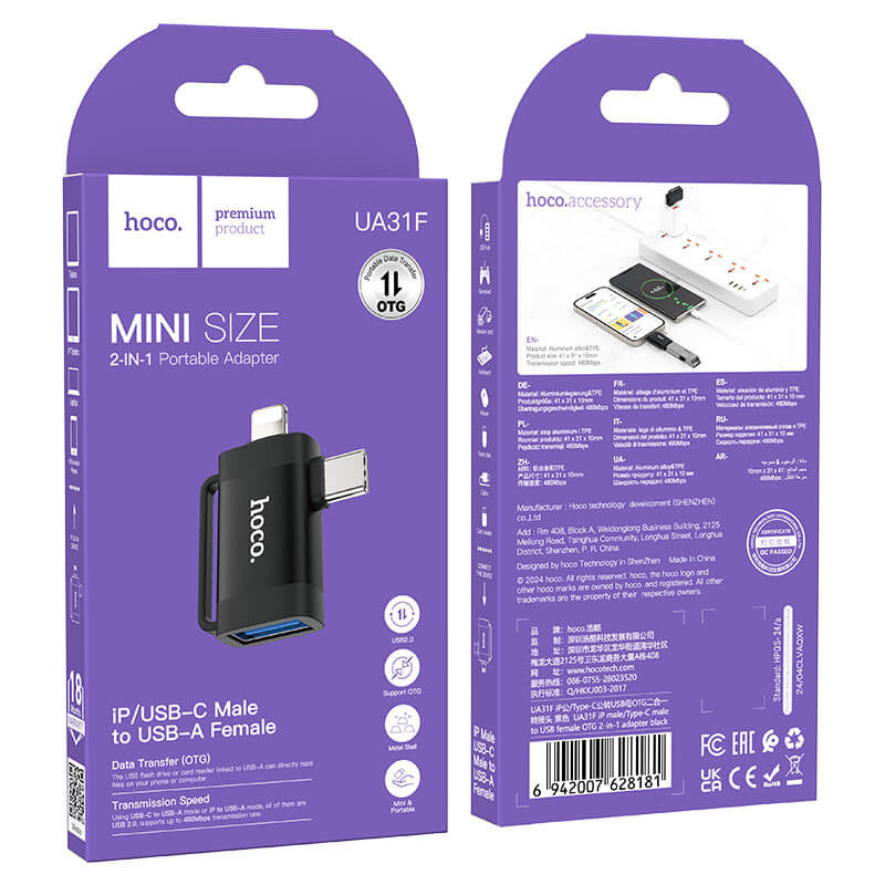 Portable adapter for Lightning and Type-C to USB-A.