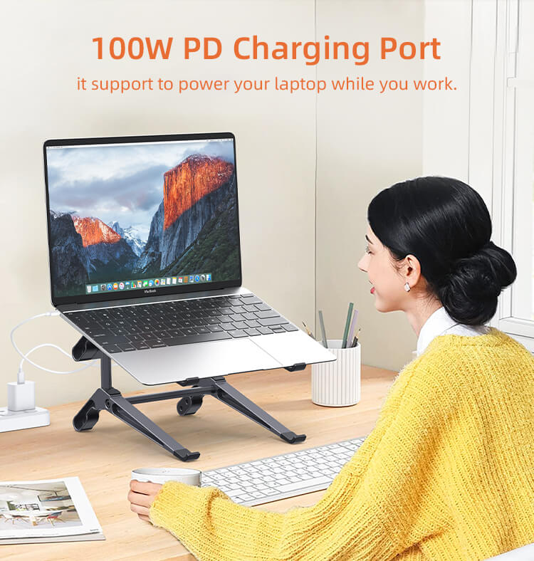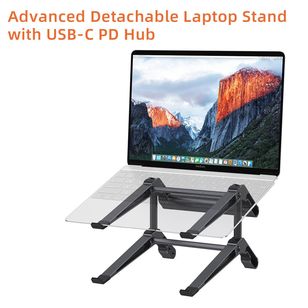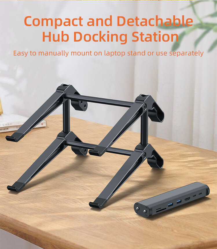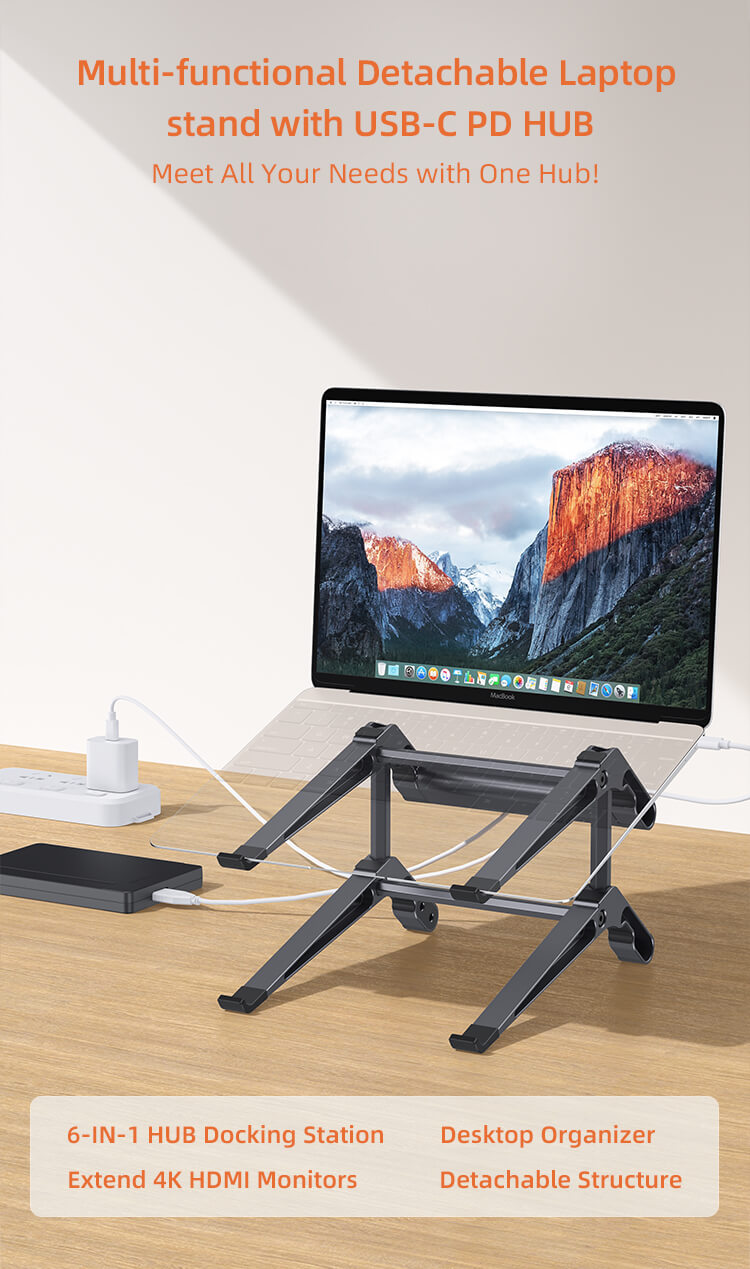 All-in-One Design: Combines a sturdy laptop riser and a detachable 6-in-1 docking hub.