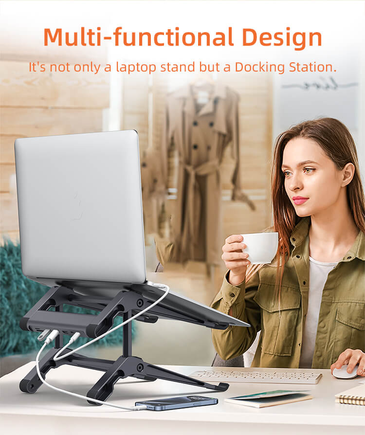Multifunctional Laptop Stand with 6-in-1 Docking Station – Adjustable, Compact & USB-C Powered