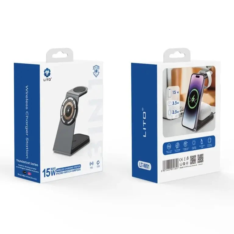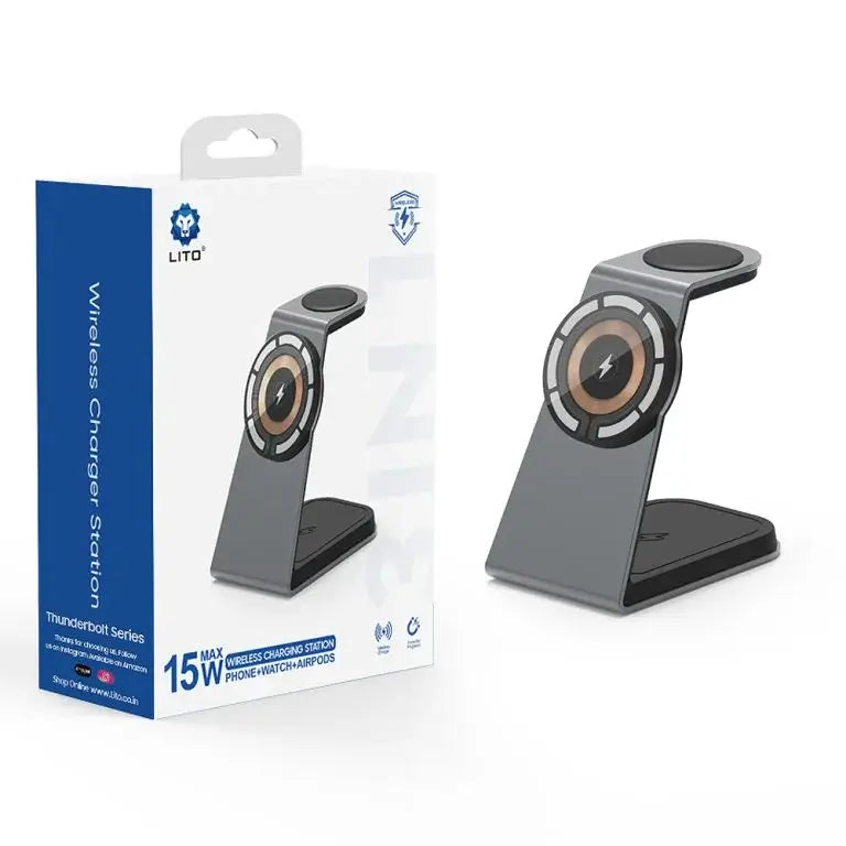 Upgrade your charging experience with the LITO 3-in-1 Wireless Charging Station, the ultimate all-in-one solution for your everyday devices. With a maximum output of 15W, this stylish and compact charger simultaneously powers your smartphone, smartwatch, and wireless earbuds — keeping your space clutter-free and your gear fully charged.