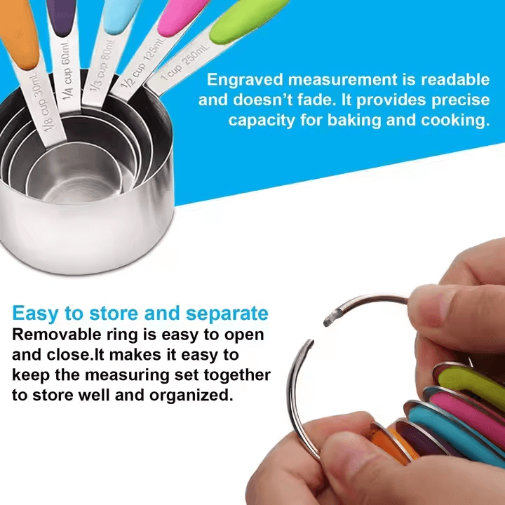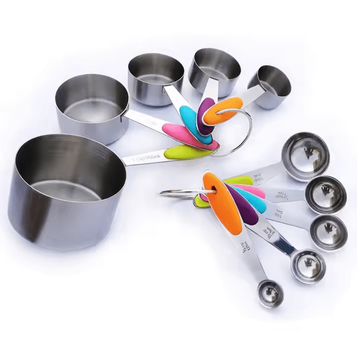 Take the guesswork out of cooking and baking with this premium 10-piece measuring set! Crafted from durable stainless steel with vibrant color-coded handles, each cup and spoon is clearly labeled with both metric and imperial measurements for maximum convenience.