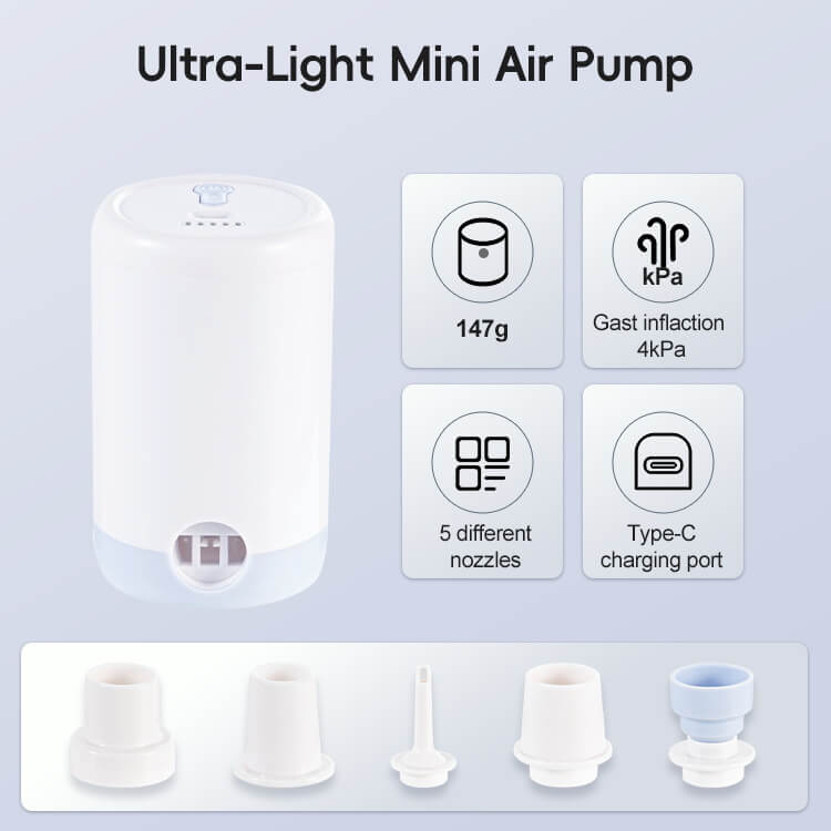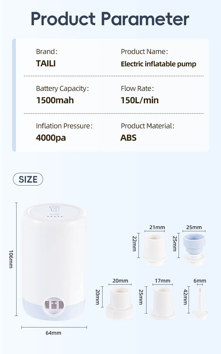 Make inflating and deflating effortless with the TAILI Ultra-Light Electric Inflatable Pump — your go-to solution for air mattresses, vacuum bags, swimming rings, sleeping pads, and more. Weighing only 147g, this mini pump packs a punch with a powerful 150L/min airflow and 4000Pa pressure, making it ideal for both indoor and outdoor use.