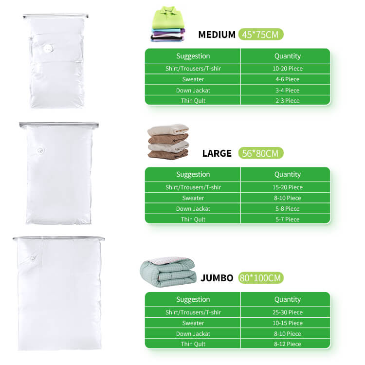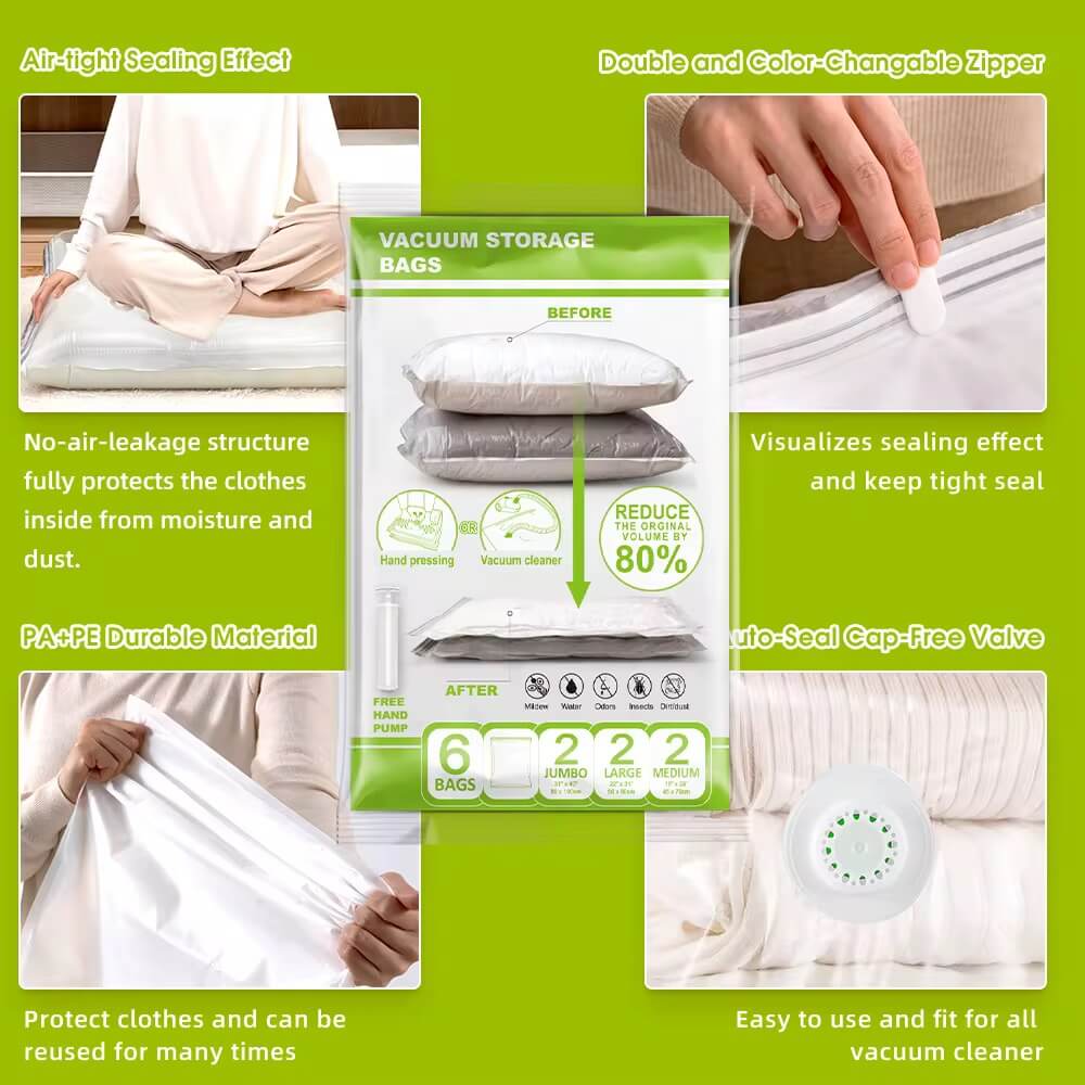 Multi-size set: Includes 6 bags – 2 Jumbo (80×100 cm), 2 Large (50×70 cm), 2 Medium (45×70 cm)